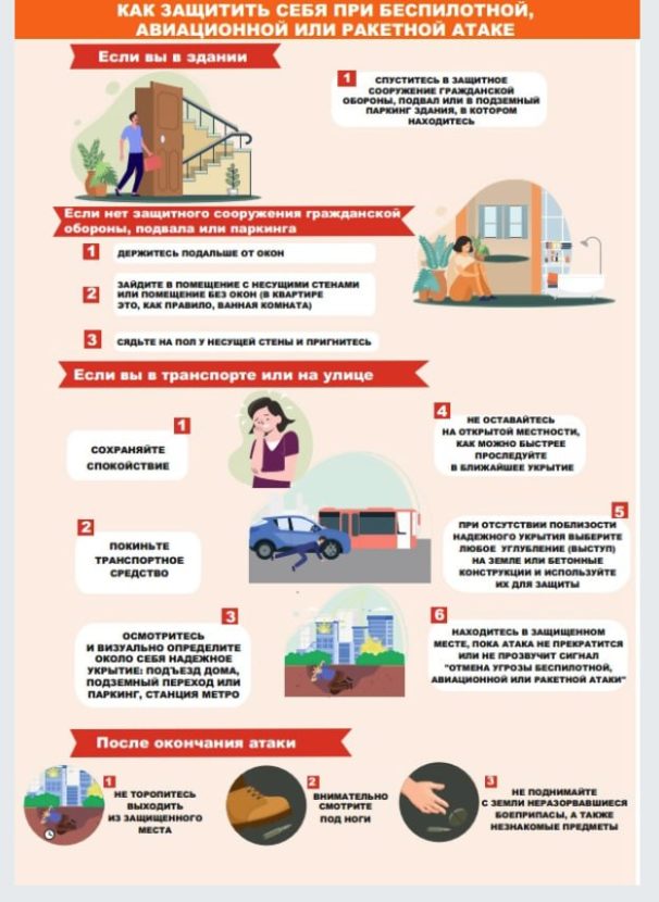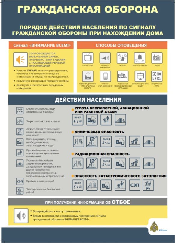 Главное управление Министерства Российской Федерации по делам гражданской обороны, чрезвычайным ситуациям и ликвидации последствий стихийных бедствий по Саратовской области разработало памятки по действиям при возникновении опасности беспилотной, авиационной или ракетной атаки, катастрофического затопления, а также радиационного (химического) заражения.