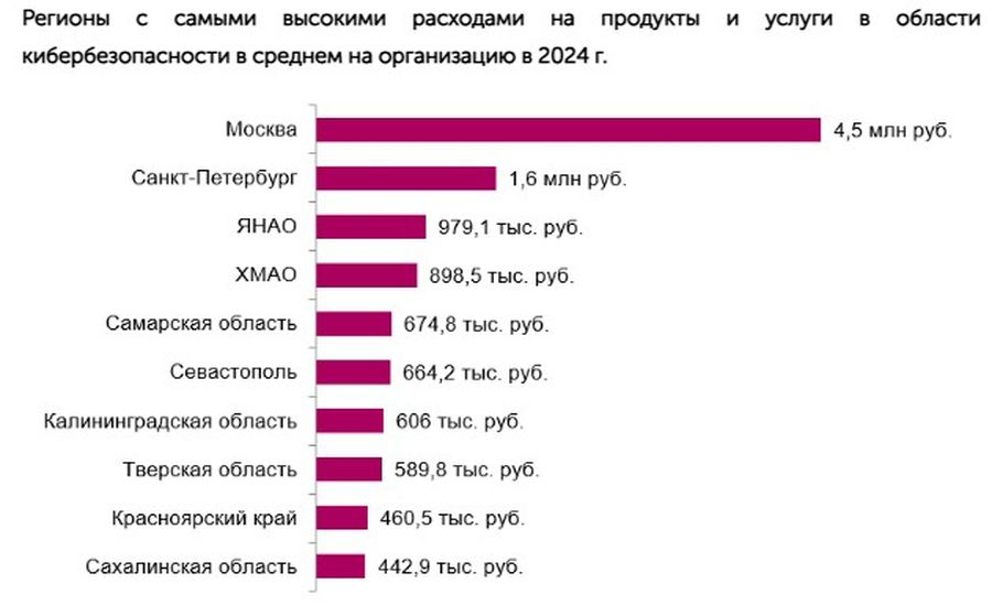 Москва остаётся абсолютным лидером: общий объём затрат на кибербезопасность в 2024 году составили 132,3 млрд. рублей (или — 63,3% всех расходов страны) и 4,5 млн. руб. в среднем на одно юридическое лицо. На втором месте по затрат на юрлицо — Санкт-Петербург (1,6 млн. рублей), а также ЯНАО и ХМАО (979 и 898 тыс. рублей).