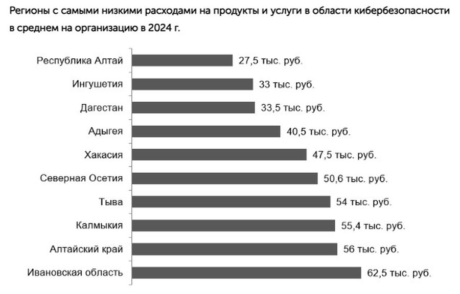 В аутсайдерах по средним затратам на безопасность на одну организацию — регионы Северного Кавказа и Сибири: от 27,5 тыс. руб. (Республика Алтай) до 62,5 тыс. руб. (Ивановская область).