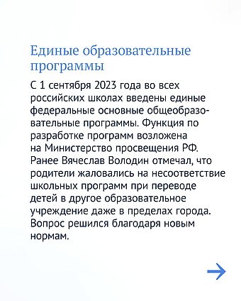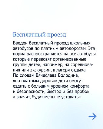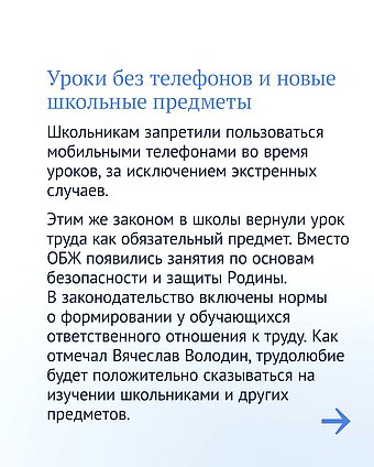 Депутаты уделяют поддержке школ и повышению качества школьного образования особое внимание. Это касается как эффективности самого процесса — учебников, предметов и программ, — так и условий, в которых проходит обучение. Речь идет в том числе о транспортной доступности школ, питании и внеклассном времени. Как отмечал Председатель ГД, «успехи государства начинаются с развития образования».