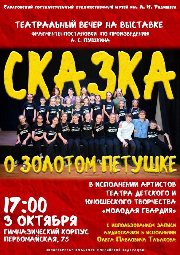 А 3 октября в рамках выставки «Олег Табаков. Настоящая жизнь» состоится показ фрагментов постановки Театра юношеского и детского творчества «Молодая гвардия» по произведению А. С. Пушкина «Сказка о Золотом Петушке».
