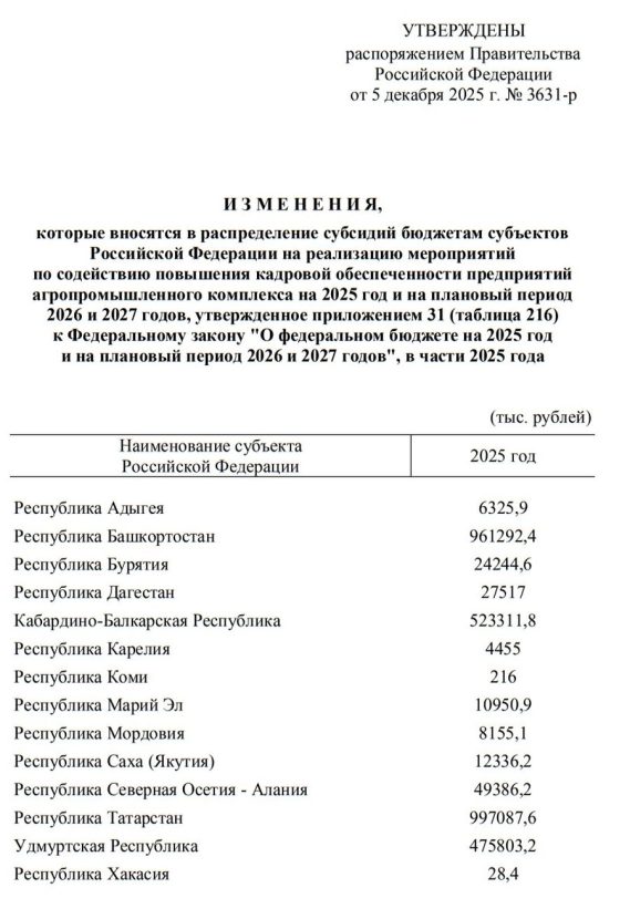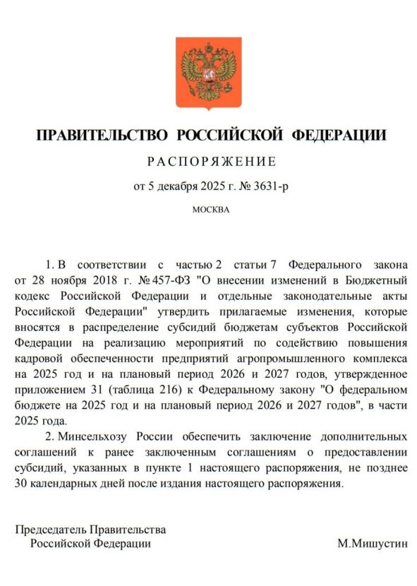Российским регионам до конца 2025 года будет дополнительно будет выделено 547,6 млн. рублей на реализацию мероприятий по подготовке кадров для агропромышленного комплекса (АПК).