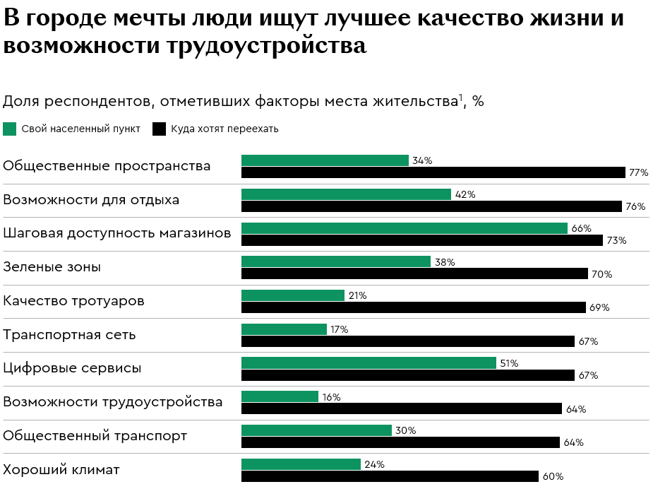 В ходе опроса респонденты отметили, что для них ключевым фактором счастья является не только экономическая составляющая, а повседневное удобство и качество городской среды. Более 70% опрошенных в качестве основных черт города своей мечты выделили:
