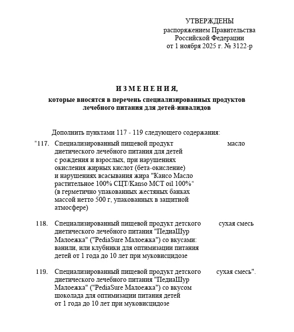 В обновлённый перечень добавлены продукты лечебного питания для детей с муковисцидозом от 1 года до 10 лет, а также для детей с нарушением окисления жирных кислот.