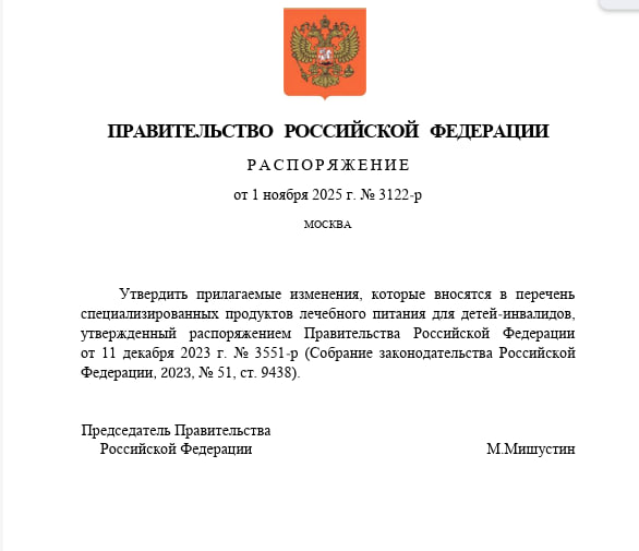 Перечень специализированных продуктов лечебного питания для детей-инвалидов расширен до 119 наименований. Распоряжение об этом подписал Председатель Правительства Михаил Мишустин.