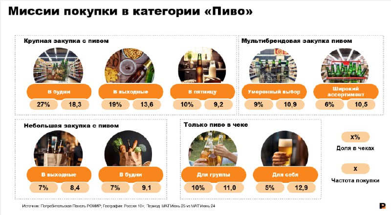 Исследовательский холдинг РОМИР проанализировал употребление пива россиянами в возрасте 18+ лет за период с июля 2024 по июнь 2025 года. Оказалось что хотя бы раз в год пиво покупали 68,4% совершеннолетних россиян. При этом 72% из них покупают его 1 раз в месяц и чаще. Средняя частота покупок в анализируемом периоде превысила 50 раз в год. Пик экспериментов с пивом приходится на возраст 35–44 года, когда в чеках превалируют мультибрендовые закупки. После 45 лет люди становятся более консервативными, чеки становятся моностилевыми. В 55+ большинство покупок относятся к категории «целевые для себя» со снижением роли совместного потребления.