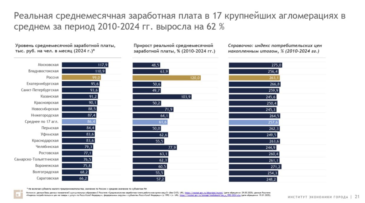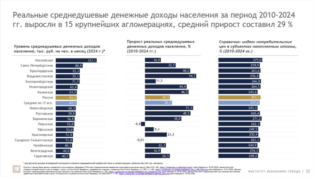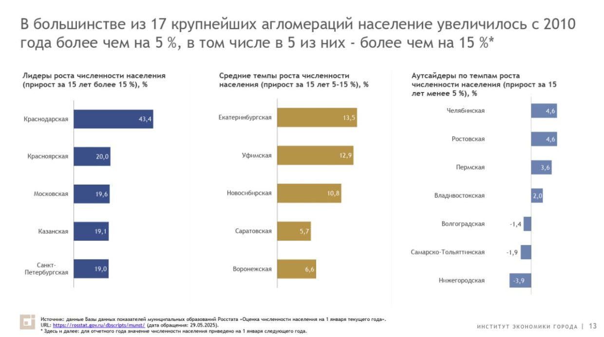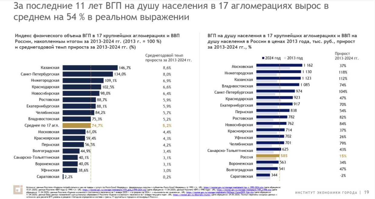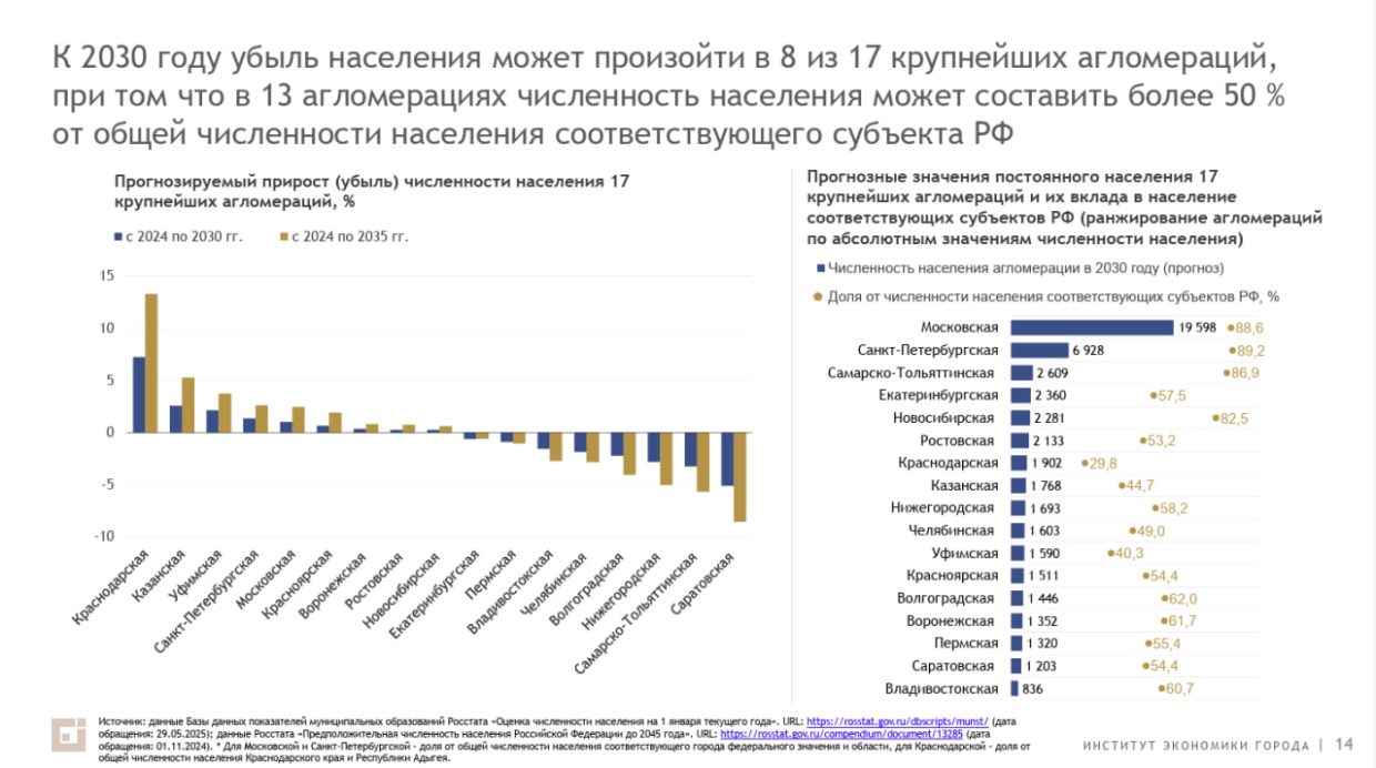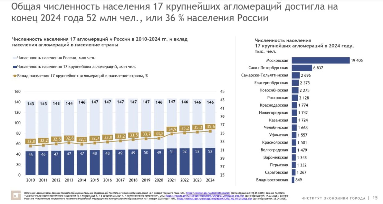 В 2025 году наш отечественный Институт экономики города обновил исследование состояния экономики, жилищной и градостроительной сфер на территориях основных российских городских агломераций, выполненное в 2023 году.