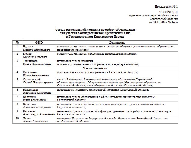 В комиссии 10 человек: два заместителя министра образования, начальник отдела министерства образования, уполномоченный по правам ребенка, главный внештатный психолог, председатель молодежной политики Саратовской области и даже сотрудник УФСБ по Саратовской области. С полным списком можно ознакомиться ниже (скриншот опубликован).