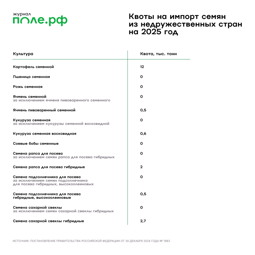 Механизм квотирования импорта семян распространяется на семена, закупаемых в недружественных странах и касается 9-ти видов культур: