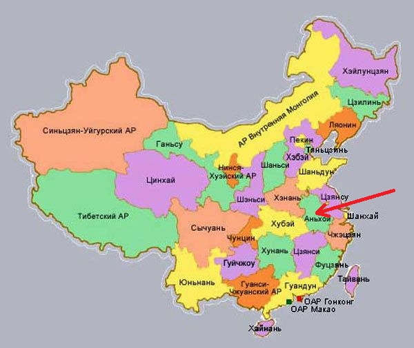 Провинция Аньхой расположена на востоке Китая, в бассейне рек Янцзы и Хуайхэ, и граничит с провинциями Цзянсу, Чжэцзяном, Цзянси, Хубэем и Хэнанем.