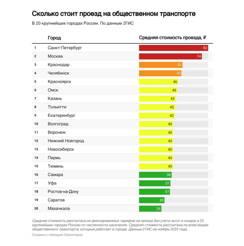 Картографический сервис 2ГИС в ноябре добавил в приложение информацию о стоимости проезда на общественном транспорте. При построении маршрута пользователи теперь видят стоимость каждого участка пути и сумму за всю поездку, если она с пересадками. Более того, аналитики геосервиса рассчитали среднюю стоимость проезда на общественном транспорте по фиксированным тарифам и сравнили по этому показателю 20 крупнейших городов страны. Получилось вот что.